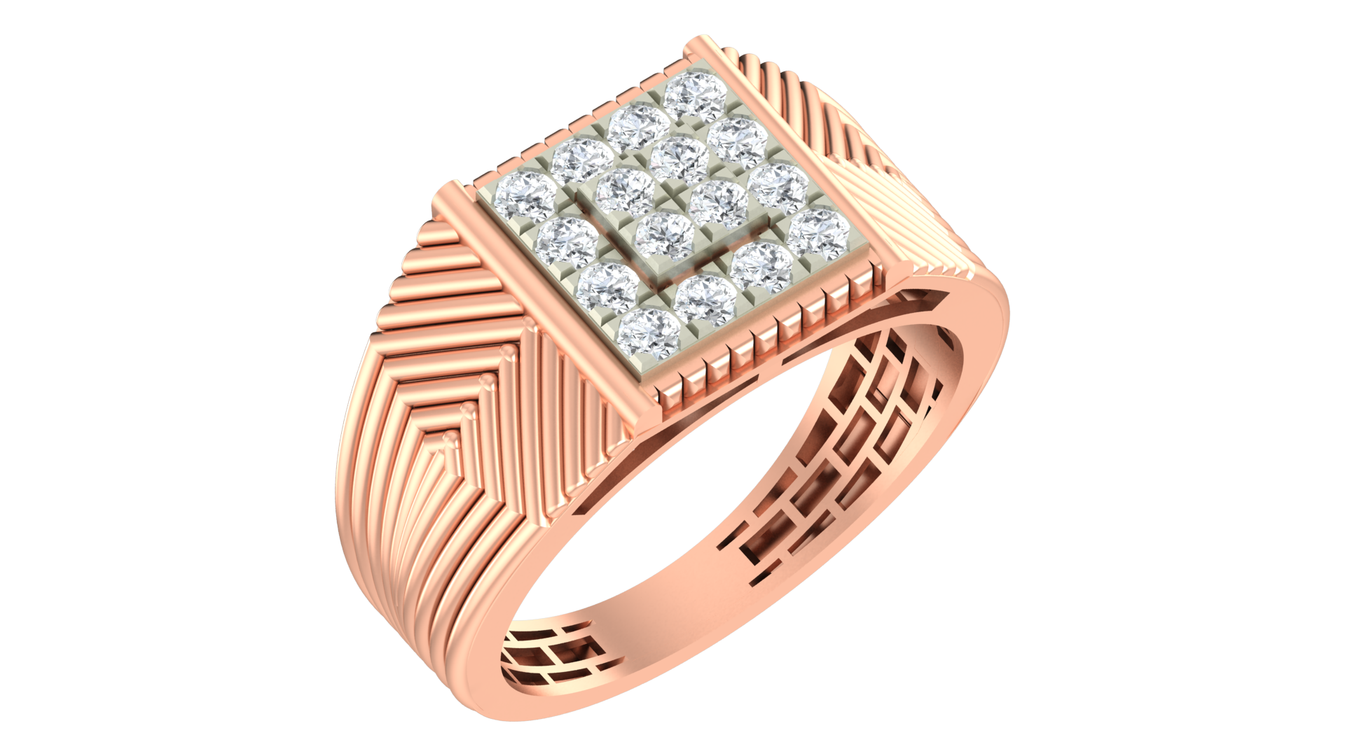 This distinguished 18K gold men's square ring showcases expertly set diamonds that command attention in social settings. The design balances sophisticated craftsmanship with bold character, making it the perfect statement piece for celebrations and formal gatherings.